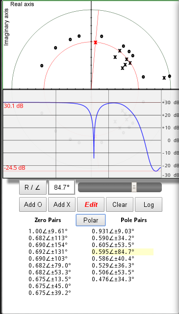 - The coordinates of the selected mark are also updated in the Zero/Pole Pairs list at the bottom of the display. The selected mark is indicated in the Zero/Pole pairs list with yellow background color.